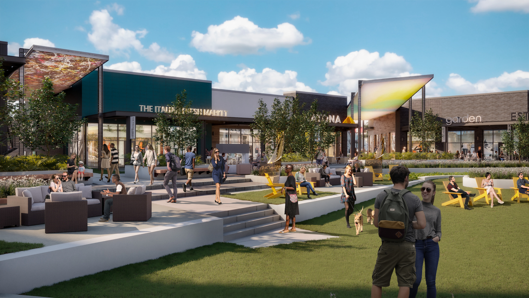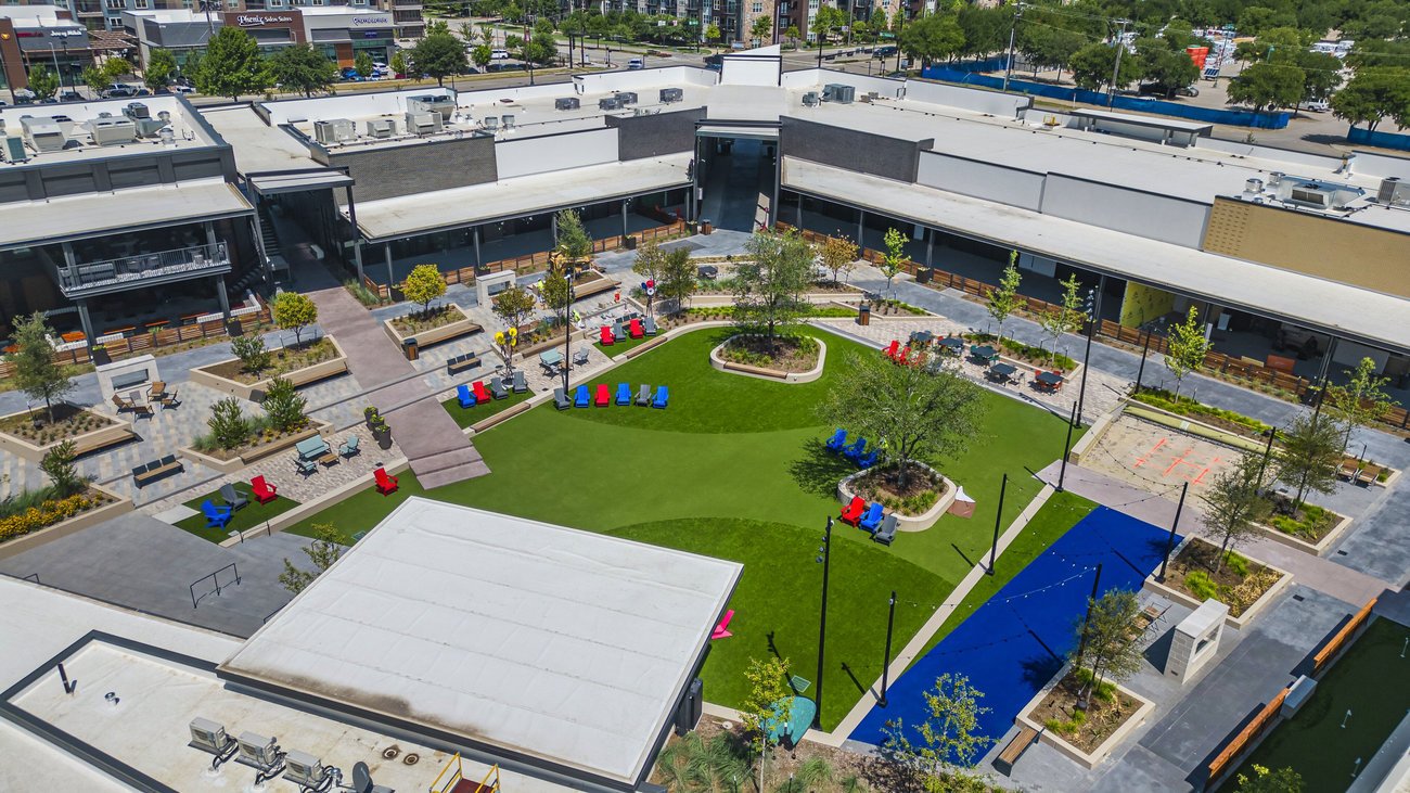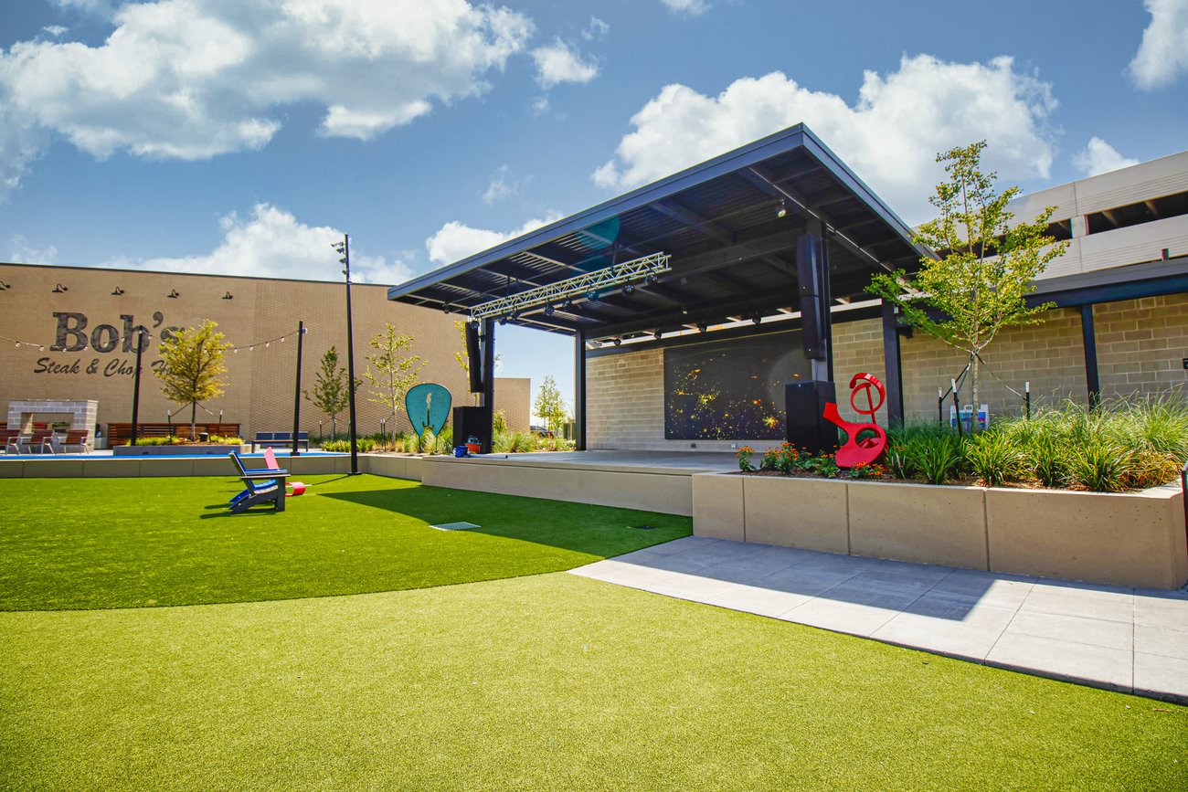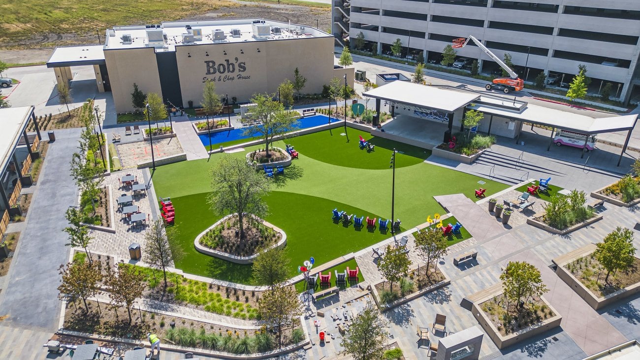 • A 0.72-acre activated park featuring a stage and a 16′ x 9′ LED screen, complemented by cozy fire pits, shaded seating spots, and a generous lawn area.